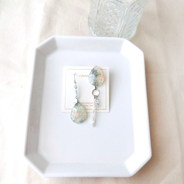 ドロップ型ガラスのアシンメトリーフックピアス(淡いボタニカル柄のリバティ)