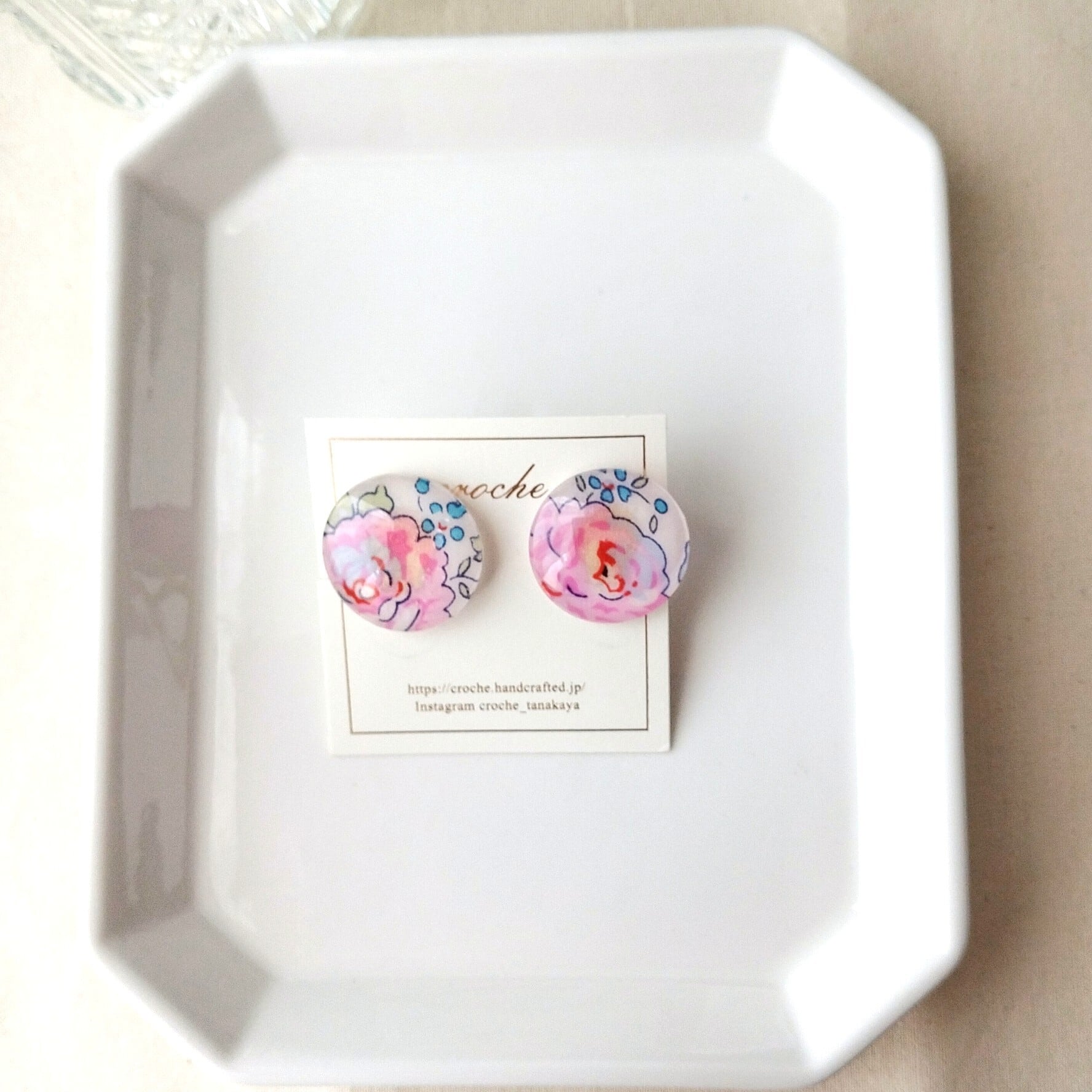 明るいピンク色の花柄リバティ生地を、存在感のあるサイズの丸型のガラスに閉じ込めた、シンプルなデザインのイヤリング。