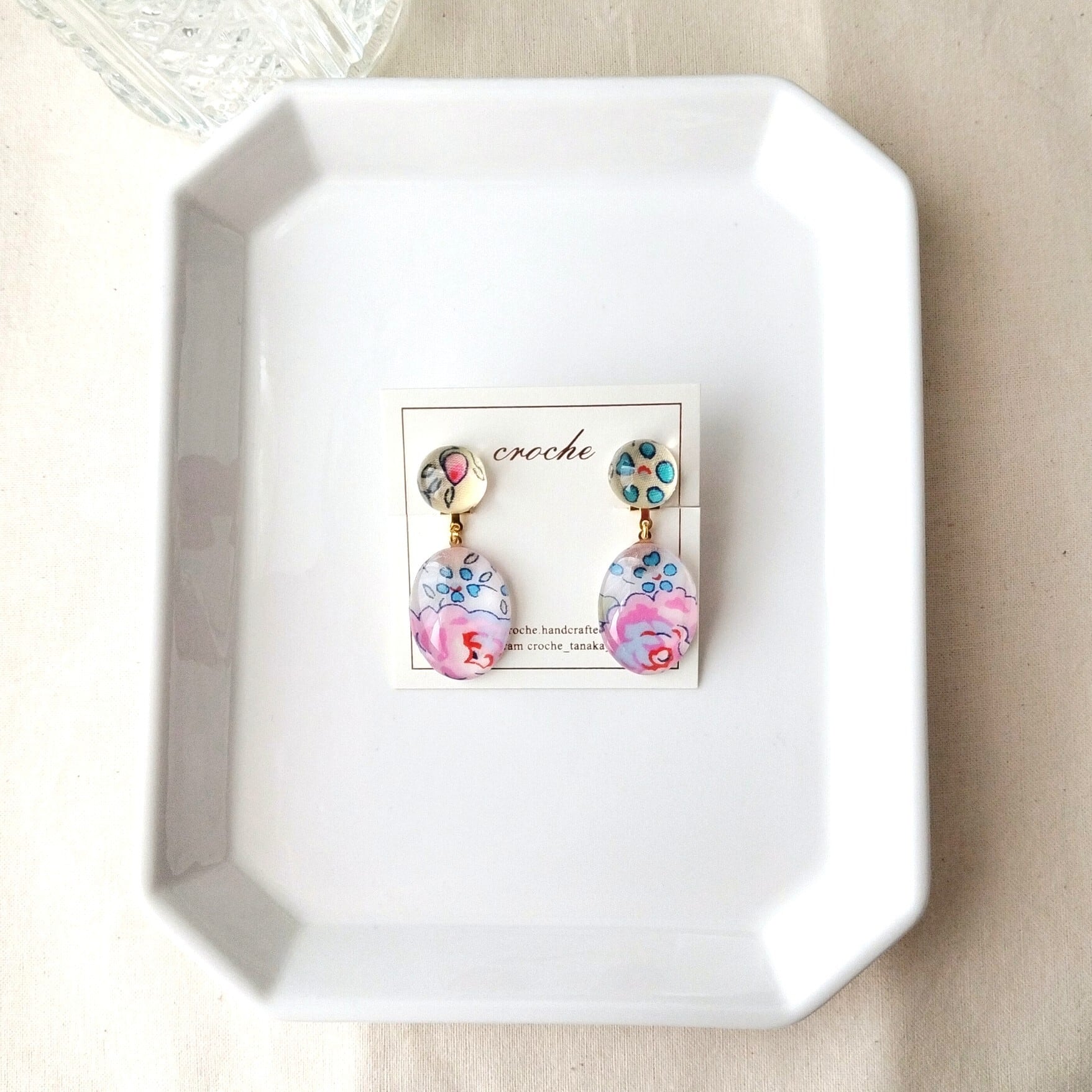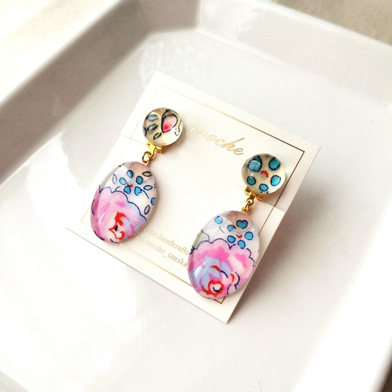 オーバル型ガラスのイヤリング(明るいピンク色の花柄リバティ)