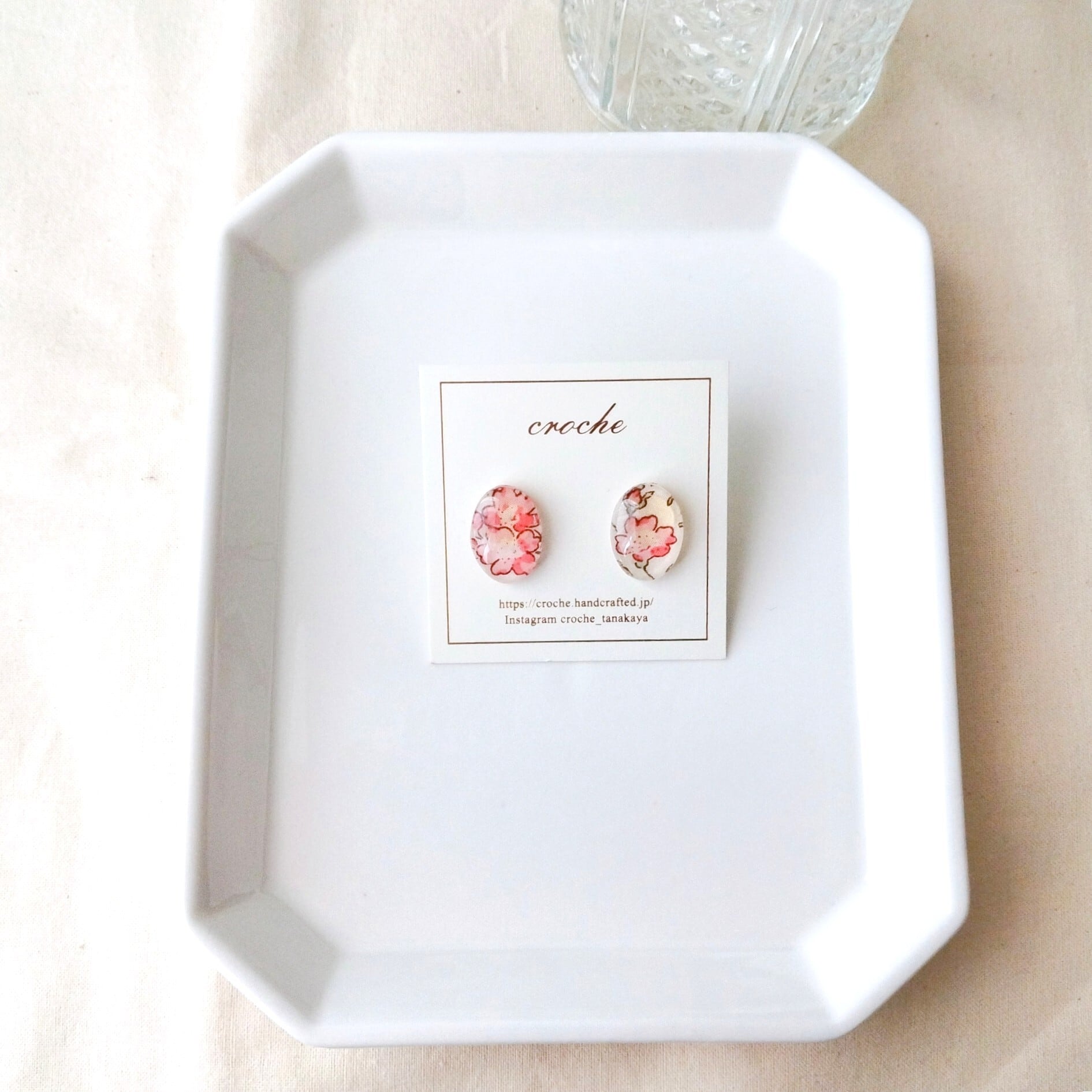 ピンク色の花柄リバティ生地を小さめのオ-バル型ガラスに閉じ込めた、シンプルなデザインのピアス。