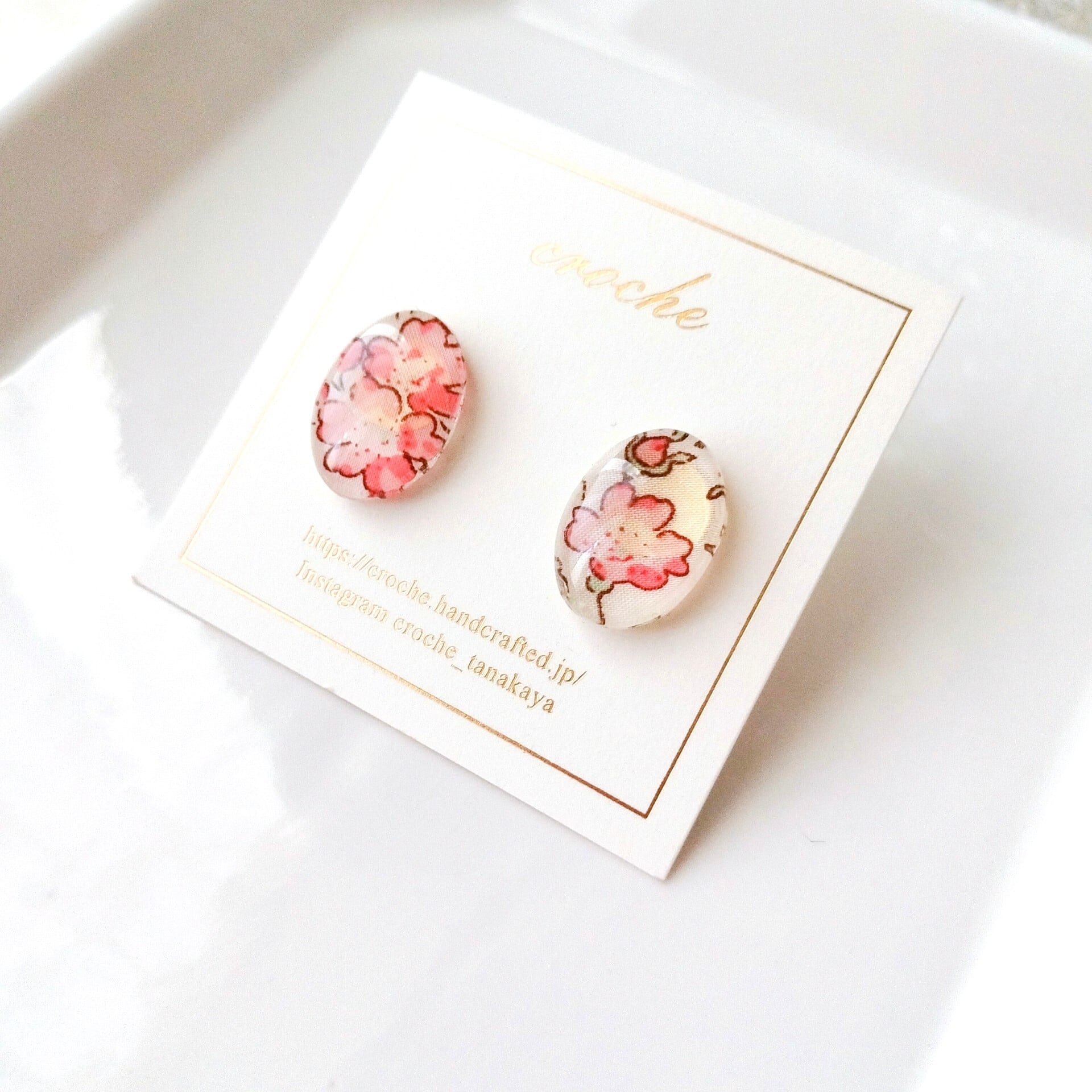 小さなオーバル型スタッドピアス(ピンク色の花柄リバティ)